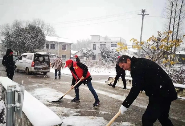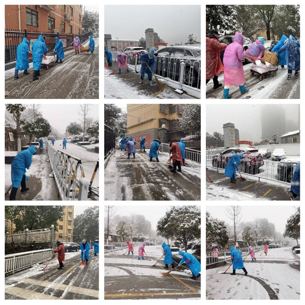 (雨花区组织各级党员干部、社区志愿者参加扫雪行动。)
