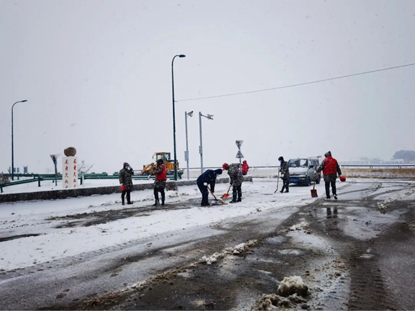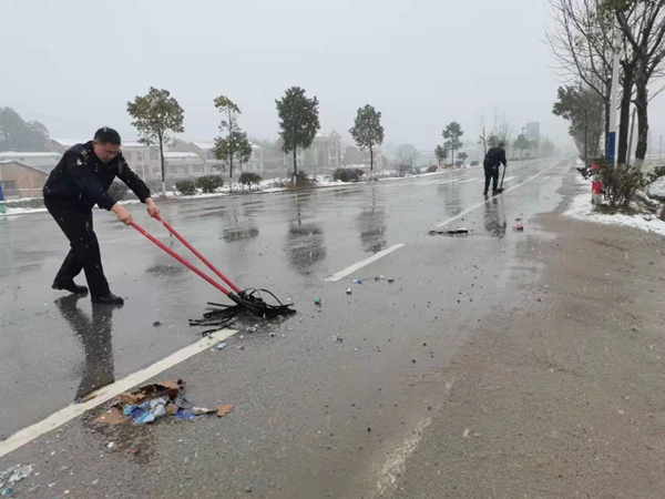 (为积极应对低温雨雪冰冻天气,2月22日,长沙县江背镇对辖区主次干道、易结冰桥梁、急弯陡坡进行安全巡查,提醒过往车辆减速慢行,确保道路交通安全,护航学生正常安全开学,辖区平安稳定。)