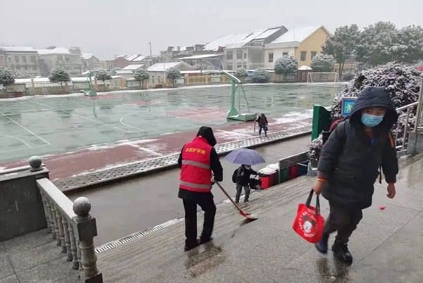 (天心区新开铺街道组织各社区(合作社)、辖区物业小区、党员志愿者对辖区学校周边、重点路段进行铲雪撒盐,保障行人、车辆出行安全。)