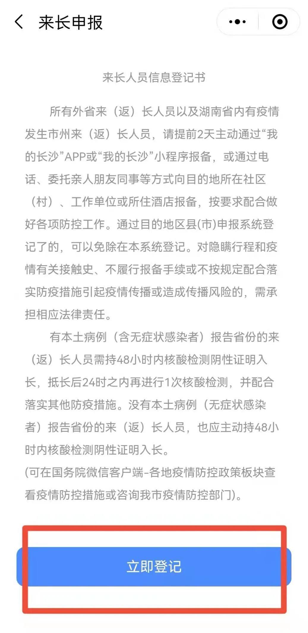 提前2天主动通过“我的长沙”APP或“我的长沙”小程序报备,或通过电话、委托亲人朋友同事等方式向目的地所在社区(村)、工作单位或所住酒店报备,按要求配合做好各项防控工作。