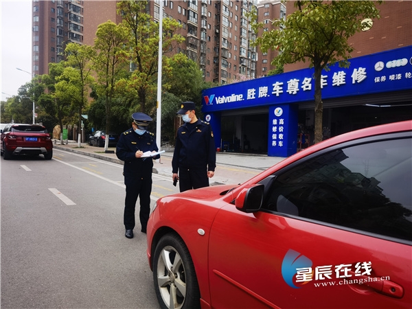(3月18日,天心区城管执法大队的队员们来到石人冲路,查处违章停放车辆。)