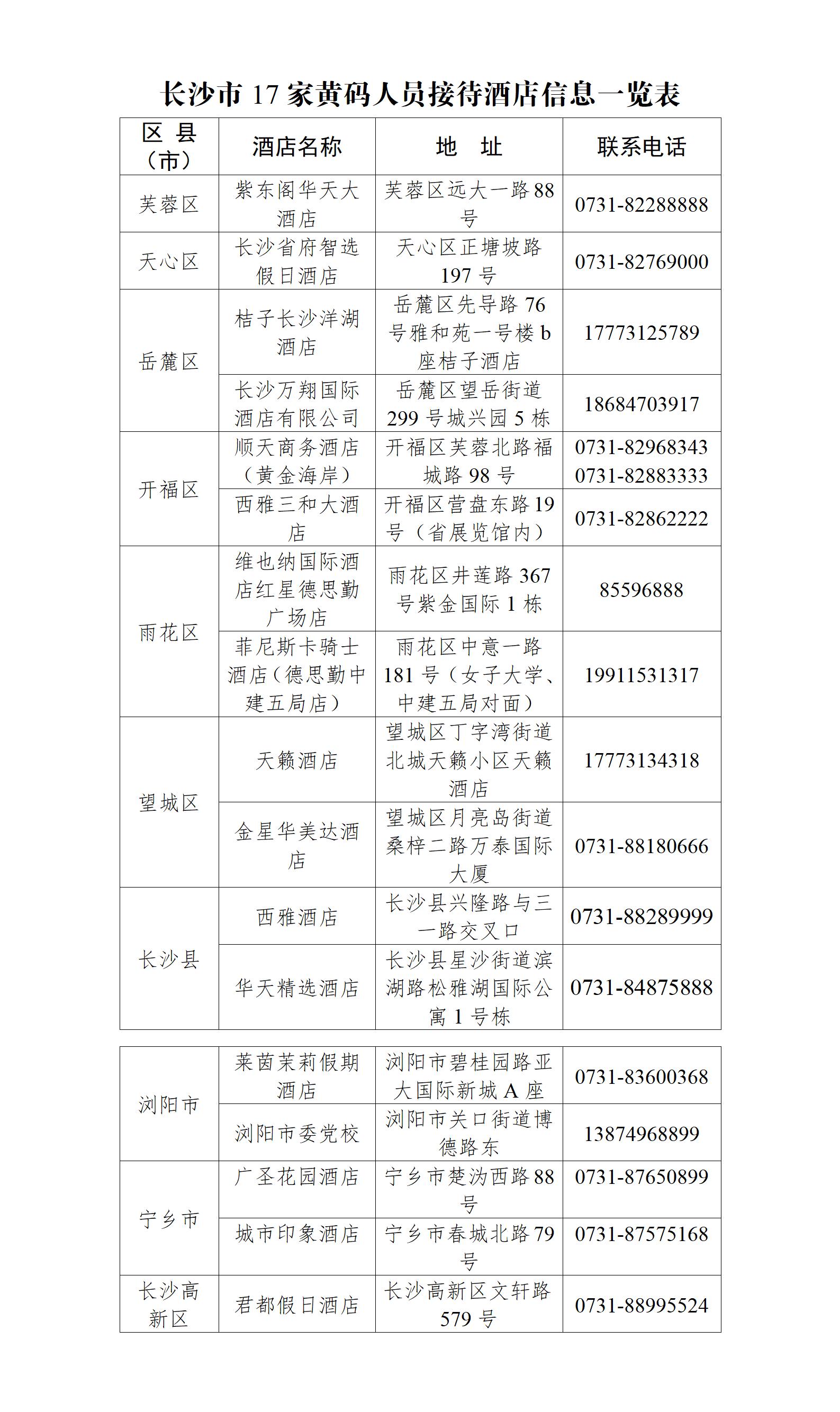 星辰在线3月21日讯 据(长沙晚报掌上长沙)报道 据长沙市新冠肺炎防控指挥部消息:近期,国内多地出现新冠肺炎反弹疫情,我市亦发生数起疫情,持健康码黄码人员增多。为方便黄码人员入住酒店,长沙市设立17家接待酒店,现予以公布。