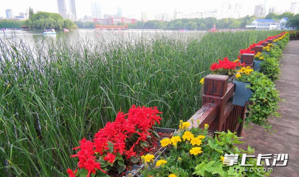 (年嘉湖山畔休闲步道,一盆盆红黄花卉,扮靓五一小长假。图片均为长沙晚报全媒体记者 贺文兵 摄)