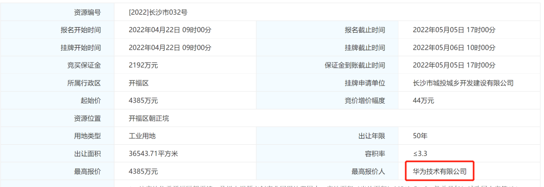 星辰在线5月6日讯 (星辰全媒体记者 晨星)刚刚,华为技术有限公司底价摘得[2022]长沙市032号地块,宗地位于开福区朝正垸,成交总价4385万元,折合楼面价约364元/㎡。