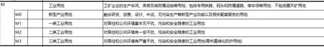 一类工业用地(M1):对居住和公共环境基本无干扰、污染和安全隐患,包括以产业研发、中试为主兼具小规模生产的工业用地,如电子工业、缝纫工业、工艺品制造工业等用地。二类工业用地(M2):对居住和公共环境有一定干扰、污染和安全隐患的工业用地,如食品工业、医药制造工业、纺织工业等用地。三类工业用地(M3):对寓居和公共设备等环境有严重干扰和污染的工业用地,如采掘工业、冶金工业、大中型机械制造工业、化学工业等用地。