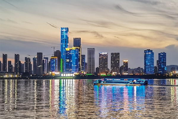 在枫叶游艇俱乐部吃完晚饭已是八时许,湘江两岸早已华灯绽放,万家灯火。林立的高楼错落有致,霓虹闪烁,天空浩瀚,星辰点点,若隐若现,倒映在江水里,有如海市蜃楼,如梦如幻。城市灯火中,最绚丽、最炫酷的莫过于两岸高楼的霓虹灯光了。据说曾几度对湘江两岸中心城区段的景观照明进行规划设计和提质改造,2020年启动的“一江两岸”城市夜景“升级版”建设,由原来的基础照明模式升级为联动表演模式。那年春节,因为疫情防控的需要,许多在长沙工作的外地人“就地过年”,春节期间,特地为在长沙“就地过年”的人们“点灯守岁”,将夜景亮化设施启闭时间延长两小时,霓虹画面不时有“秀色长沙”“厚重长沙”“快乐长沙”“创意长沙”的字体跳出及动画表演,展现出长沙独有的城市温馨与魅力。如今的霓虹灯光,是在两年前的“升级版”是再提质升级的,更加丰富多彩、美轮美奂。