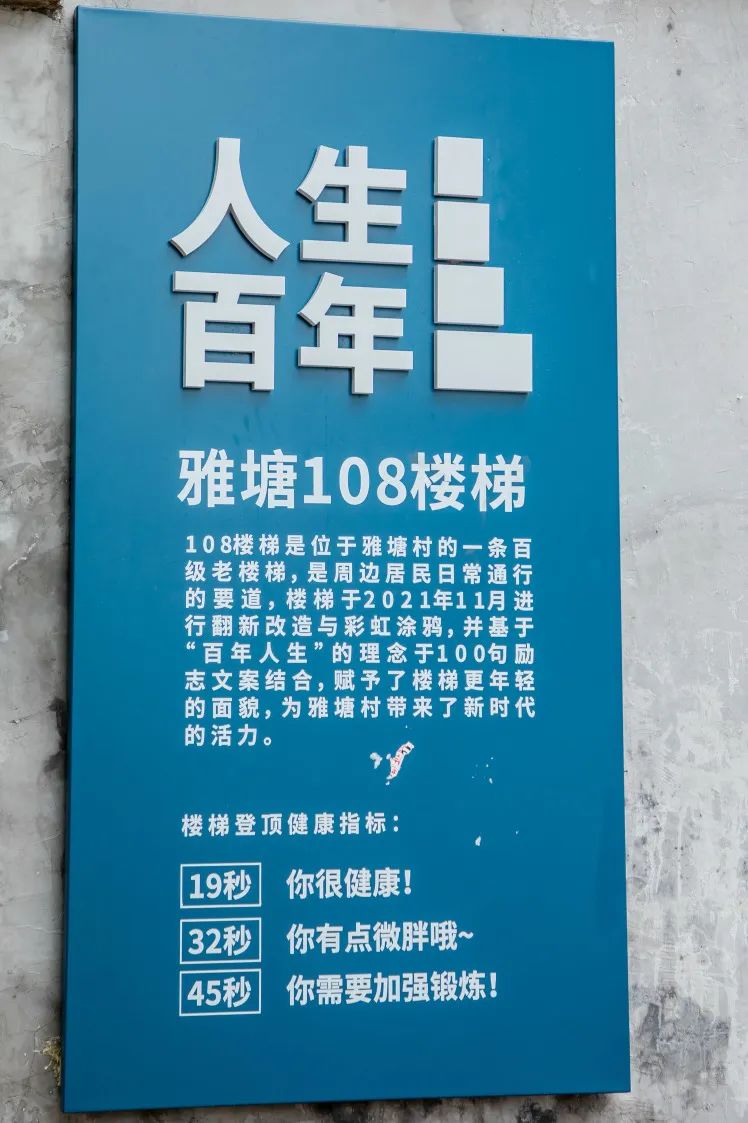 代表着人生寓言的108阶人生楼梯,便位于雅塘村小学边。从1岁到108岁,这里一共有108阶楼梯,代表着人生不同阶段的想法与思考。不管是来着拍照打卡,还是思考片刻,都是不错的选择。