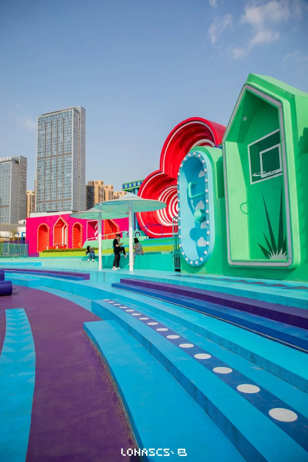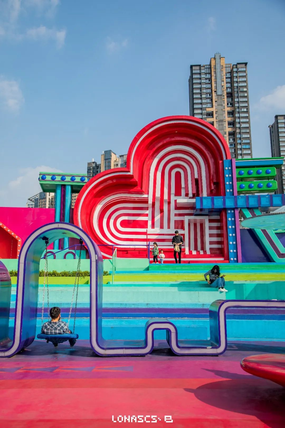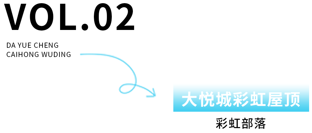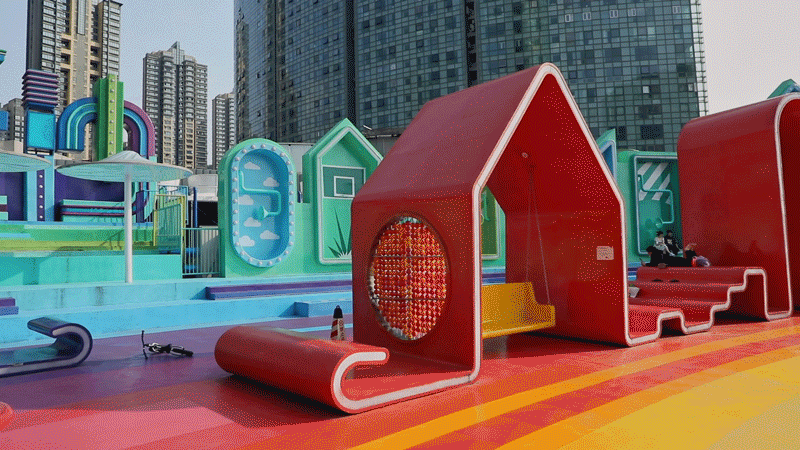 “I❤长沙”,北辰大悦城在天台打造出一个彩虹色的“天空之城”。以彩虹作为灵感源泉,再融入各式曲线形的设计,将休息的长凳、玩乐的秋千、拍照的背景,都巧妙地融合在了一起。