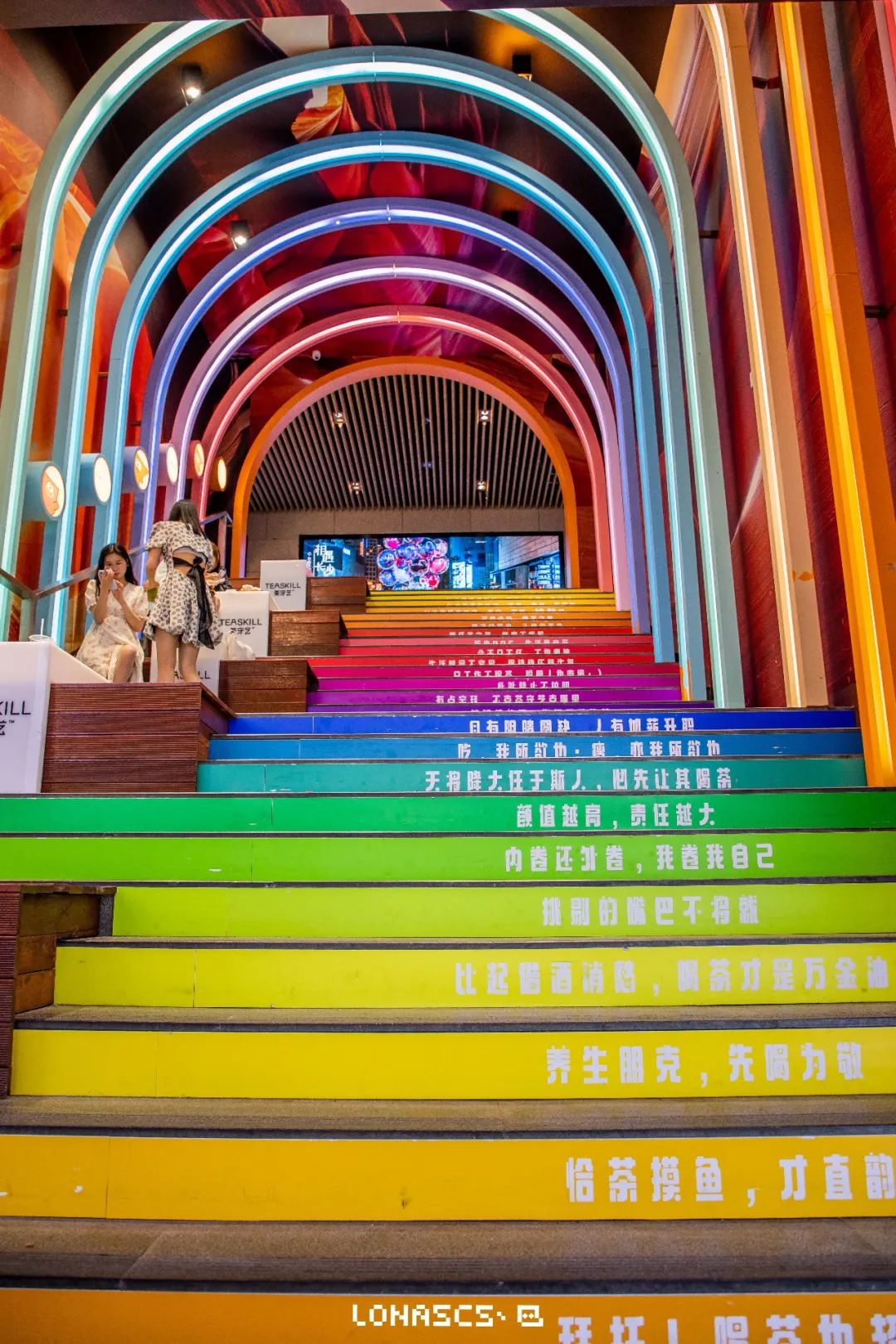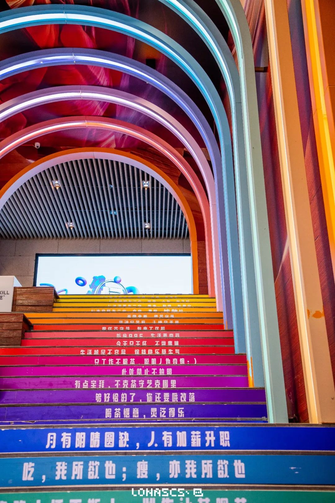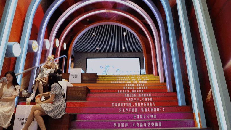 区别于雅塘村的人生108楼梯的格言,国金街的彩虹楼梯便颇有些打趣的意味。“吃,我所欲也;瘦,亦我所欲也”、“喝茶惬意,灵泛得乐”、“有阴晴圆缺,人有加薪升职”...随处可见的都是“网络”语录。