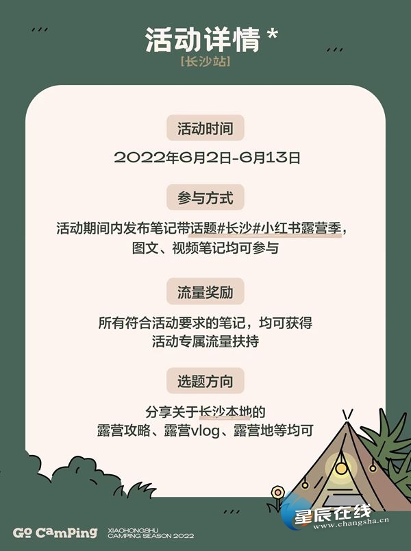 据星辰全媒体记者了解,本次露营季长沙站活动时间为2022年6月2日-6月13日,活动期间发布关于长沙本地的露营攻略、露营vlog、露营地的笔记(图文、视频笔记均可),带话题#长沙#小红书露营季,即可参与。