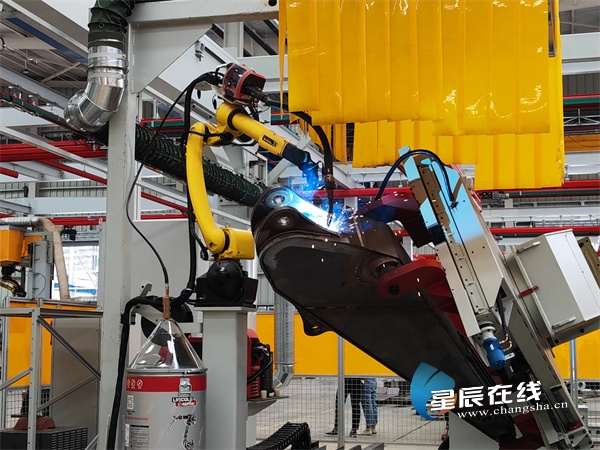 星辰在线6月20日讯(星辰全媒体记者 周雨晴 吴樱)“呲呲呲”……在位于长沙经开区的山河工业城三期项目挖掘机动臂智能化焊接产线上,几十台智能化机器整齐排列,正在做焊接工艺,星辰全媒体记者站在产线前沿,由近及远看,偶尔能发现一两个工人穿梭在产线。