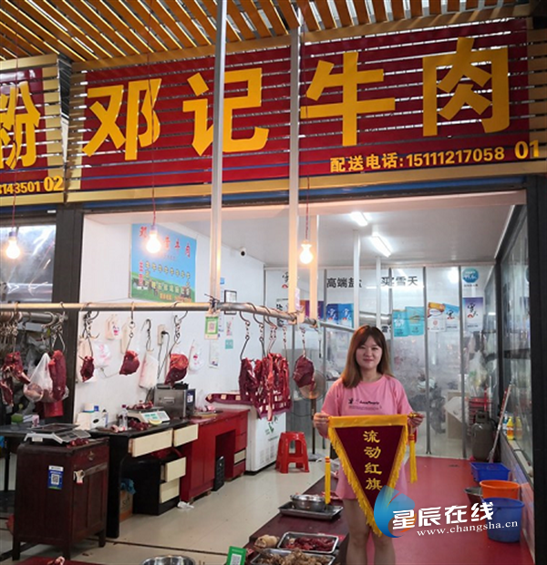 星辰在线7月2日讯(通讯员 任咏梅)6月29日,天心区新市街农贸市场和兴威农贸市场,每月举行的“文明经营户”的流动红旗评选又按时开始了。这次,新市街农贸市场邓记牛肉经营户摊主领到了流动红旗,心里别提多开心。