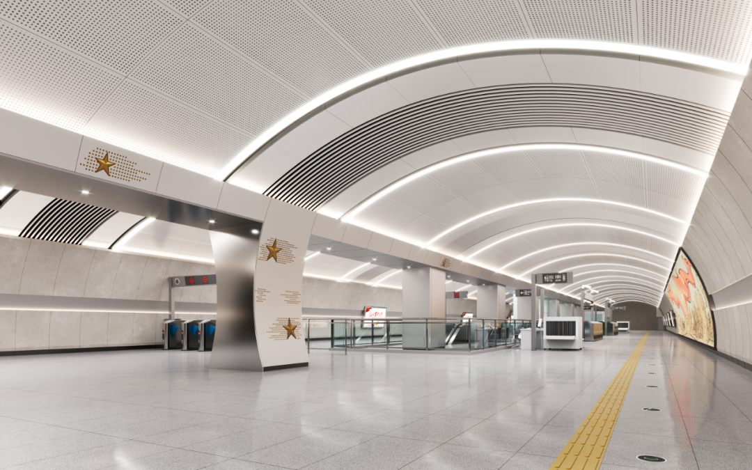 烈士公园南站以“革命传承”为主题,注重周边环境和谐,赋予本站“雄浑伟岸、明快庄严”的空间体验。