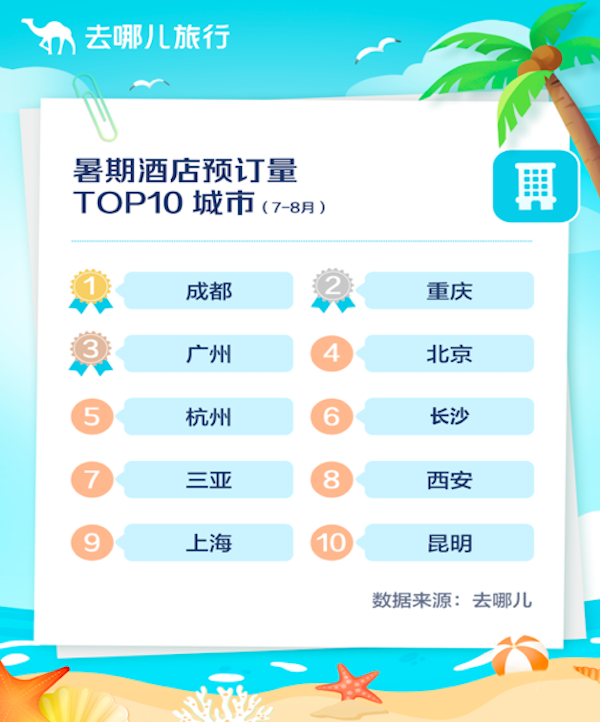 去哪儿平台数据显示,今年暑期(7~8月)酒店预订量TOP10城市是:成都、重庆、广州、北京、杭州、长沙、三亚、西安、上海和昆明。