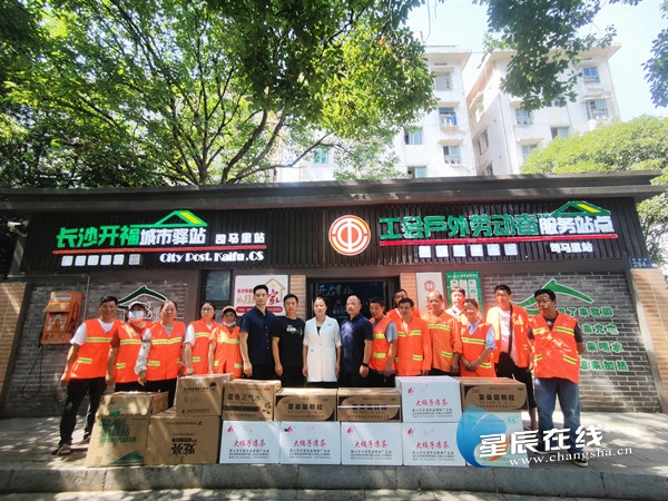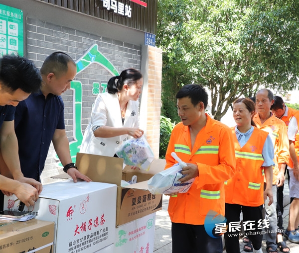(7月14日,开福区市容环境卫生维护中心工作人员来到长沙开福城市驿站司马里站,为他们送去关怀和问候。图片由 星辰全媒体记者 贺亚玲 摄)