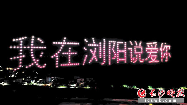 (520架无人机打造科技感烟花秀,在澄净夜空中写下情书。 均为长沙晚报全媒体记者 陈飞 李锋 摄影报道)