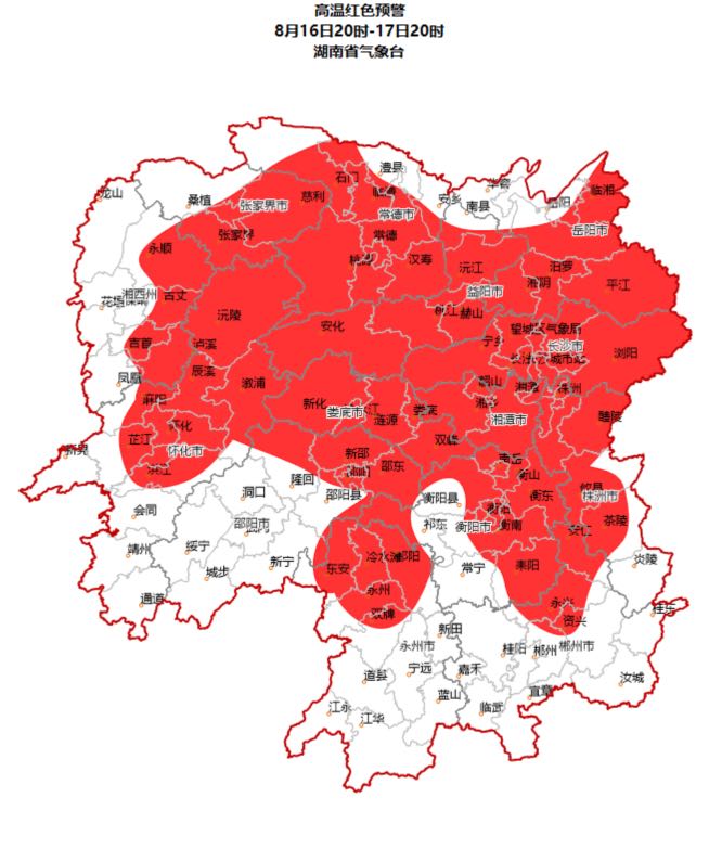 星辰在线8月16日 (星辰全媒体记者 晨星)湖南省气象台今日再发高温红色预警:预计16日20时至17日20时,长沙、株洲、湘潭、衡阳、邵阳东北部、岳阳、常德、张家界、益阳、郴州北部、永州北部、怀化、娄底、湘西州东部将达到39℃以上高温,局部地区将达40℃以上。