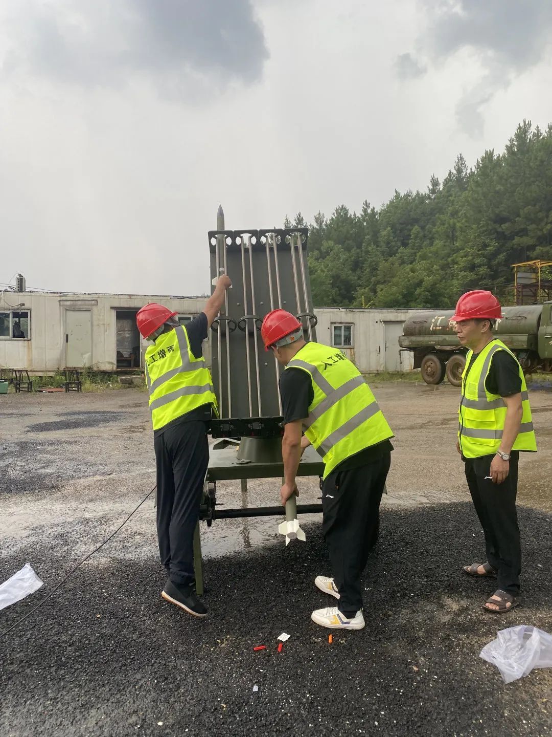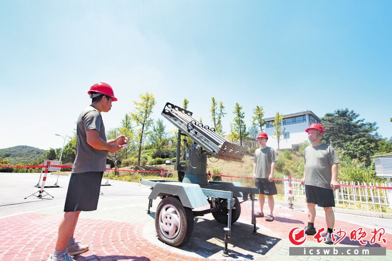 远离城市喧嚣,位于山林之巅,岳麓区的民兵训练靶场因视野开阔被选为人工增雨炮点。炮点作业区毫无树木遮挡,在阳光下待十几分钟,体感温度很快就超过40℃,靠近装载火箭弹发射架的特种车,热浪更是迎面扑来。