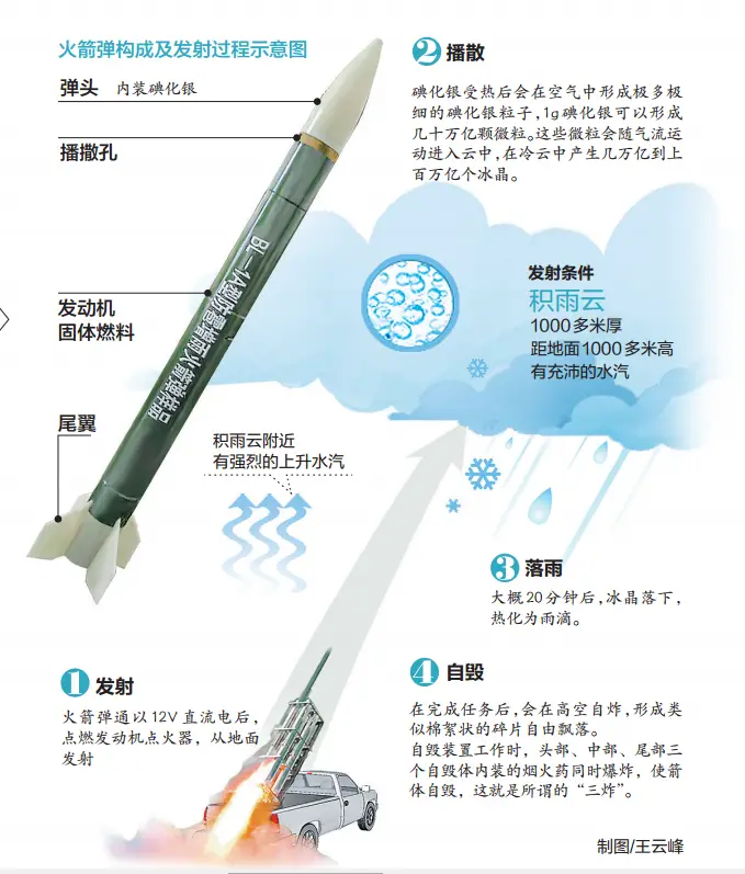 火箭弹通以12V直流电后,点燃发动机点火器, 从地面发射,在云中爆炸,把炮弹中的碘化银燃成烟剂撒在云中。碘化银只要受热后就会在空气中形成极多极细的碘化银粒子,1g碘化银可以形成几十万亿颗微粒。这些微粒会随气流运动进入云中,在冷云中产生几万亿到上百万亿个冰晶。大概20分钟后,冰晶落下,热化为雨滴。