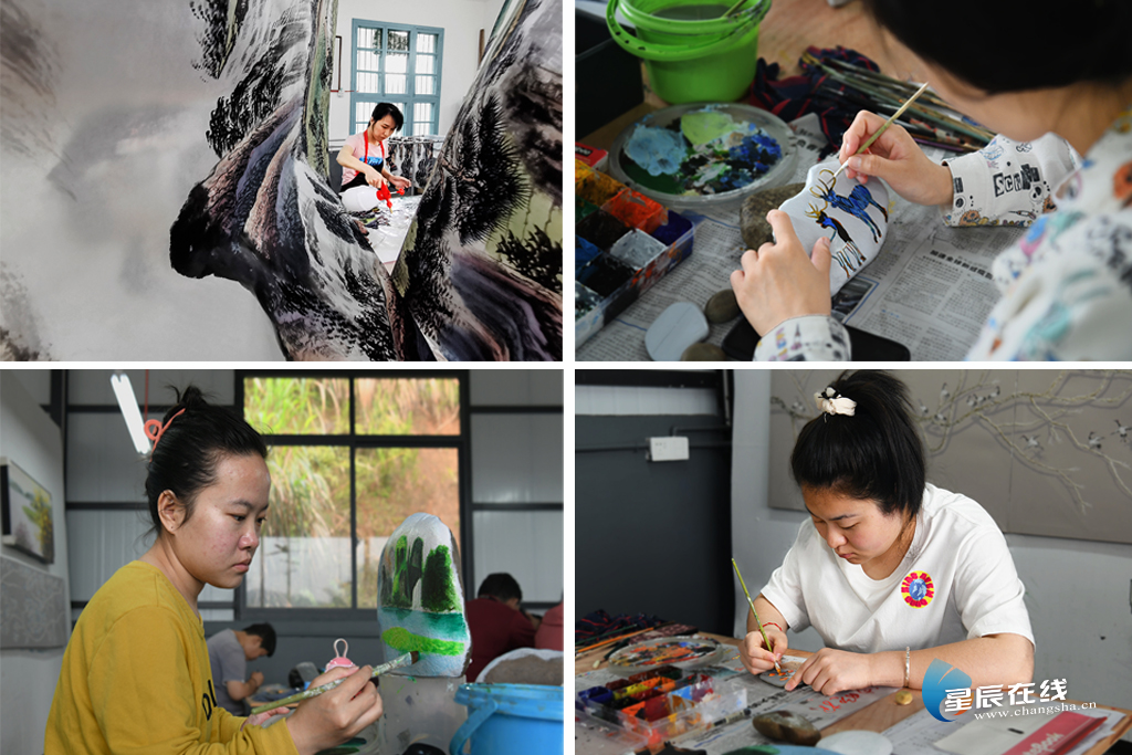 锐意探索发展农民画室文旅新产业。小河乡依托扶贫建立起来的画室,发挥农民画师多的优势,积极与湖南省女画家协会、湖南省民间美术研究会和相关美术院校寻求合作,设立写生创作基地,打造一个集书画产业、创作写生、书画体验度假于一体的“山水画乡”。依托农民画师队伍,采用当地小石头,开发了卡通、山水画、油画等不同系列和风格的小石头画文旅小产品,成为深受游客喜爱的“伴手礼”。