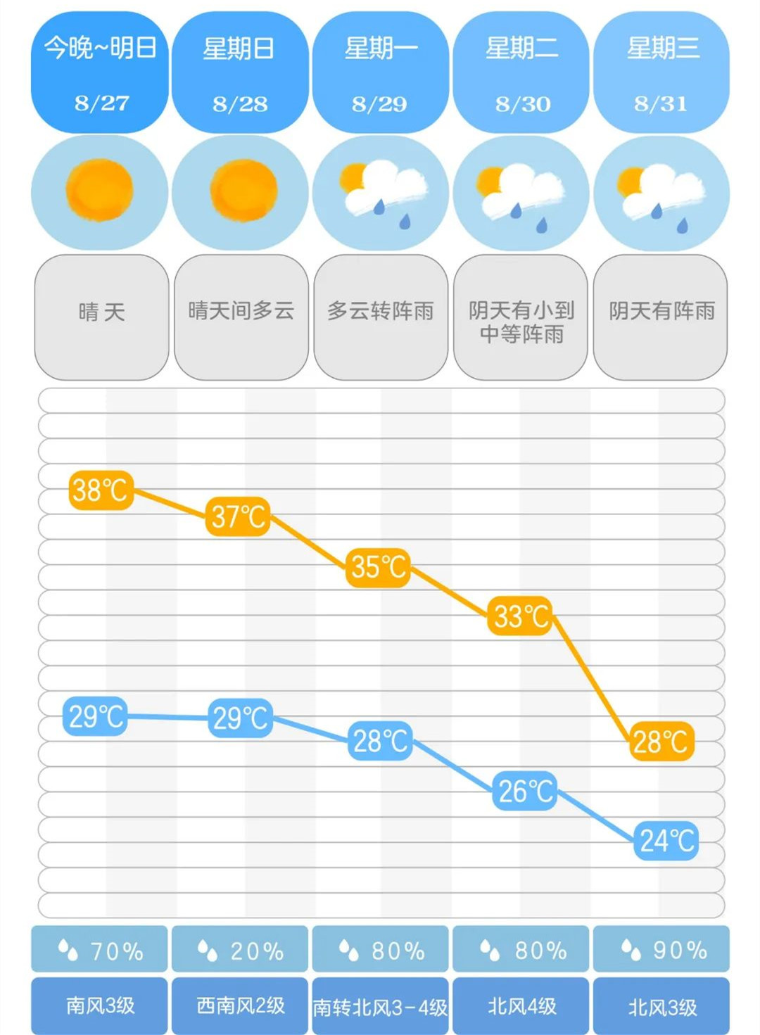 长沙市气象台预计:8月29~31日,受到冷空气的影响,有一次降温降雨的天气过程,届时的最高气温将降至28℃,最低气温将降至24℃,气温下滑明显,最高气温将会下降10℃。