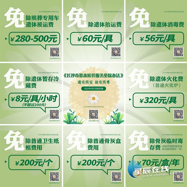 生老病死和每个普通人息息相关。自长沙市开展殡葬改革工作以来,一直坚持殡葬公益属性,减轻群众治丧负担。此次新出台的配套《条例》出台的《长沙市基本殡葬服务费用免除办法》(以下简称《办法》)明确了免除的对象和项目及标准。