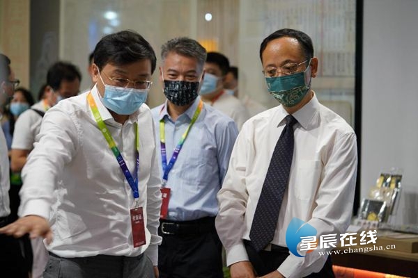 (国家文物局党组副书记、副局长顾玉才<右>参观第九届中国博博会湖南博物院展区。)