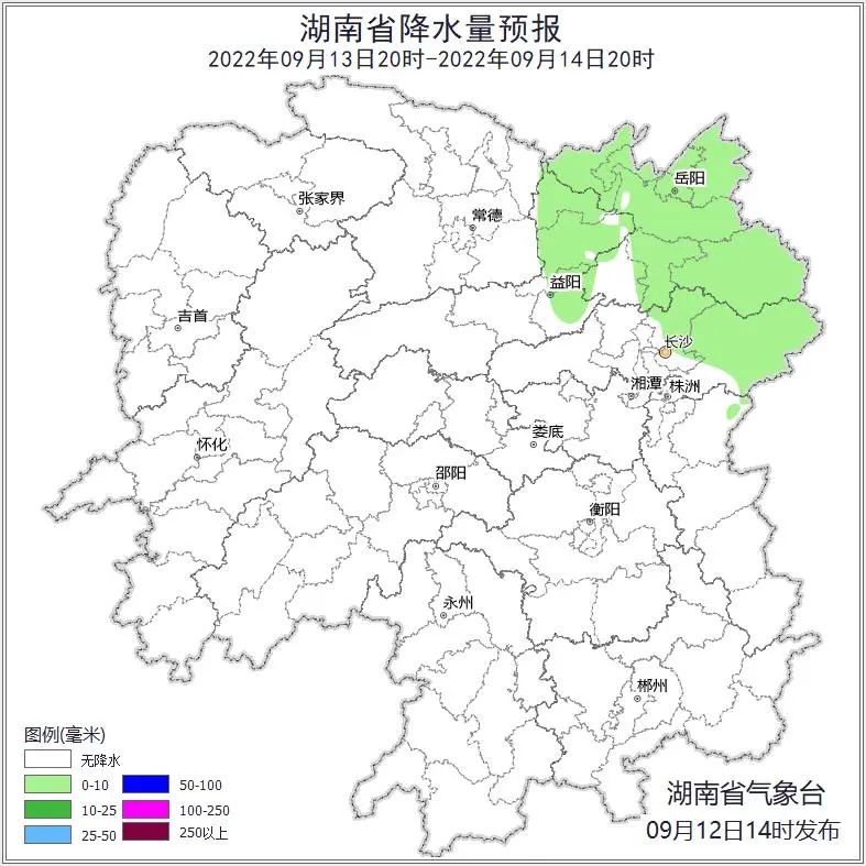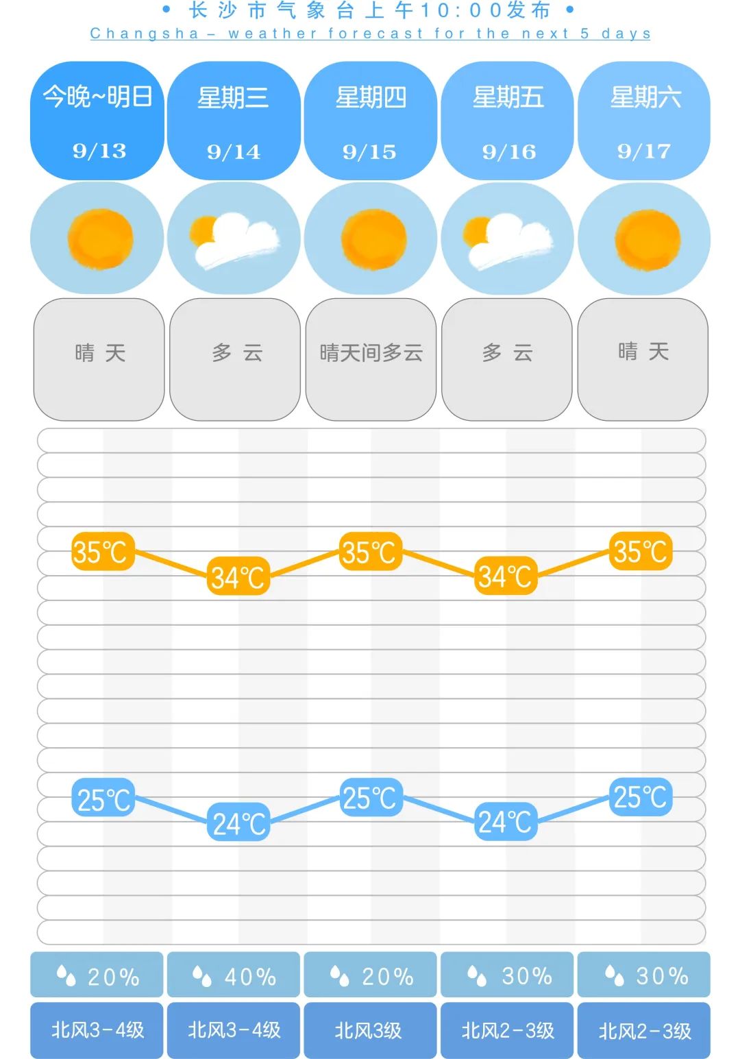 13日20至14日20时,多云间晴天,其中岳阳、益阳北部、长沙东部局地有阵雨;北风3~4级;最高气温33~35℃;最低气温22~24℃。