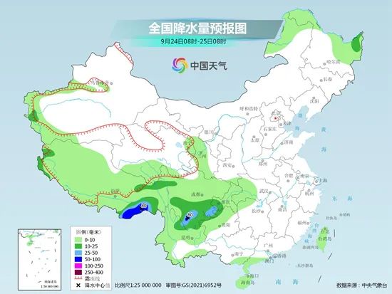 具体来看,9月24日,内蒙古东北部、黑龙江北部、新疆南疆西部、西藏、四川、重庆、云南、贵州中北部、华南地区南部、台湾岛等地部分地区有小到中雨,其中,西藏东南部、四川南部、云南北部等地部分地区有大雨,局地暴雨(50~80毫米)。