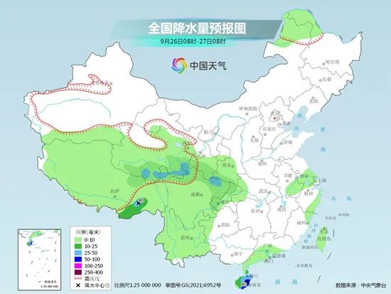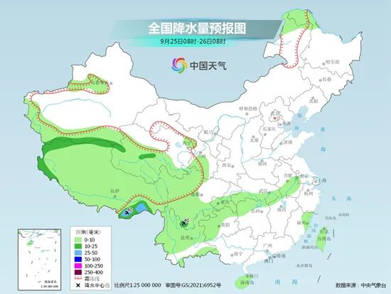 9月25日,新疆南疆西部和南部、西藏、青海中南部、四川西部和南部、云南、贵州、重庆南部、贵州北部、湖南北部、湖北南部、安徽南部、福建东北部、海南岛、台湾岛等地部分地区有小到中雨,其中,西藏南部、四川南部等地局部大雨(25~40毫米)。