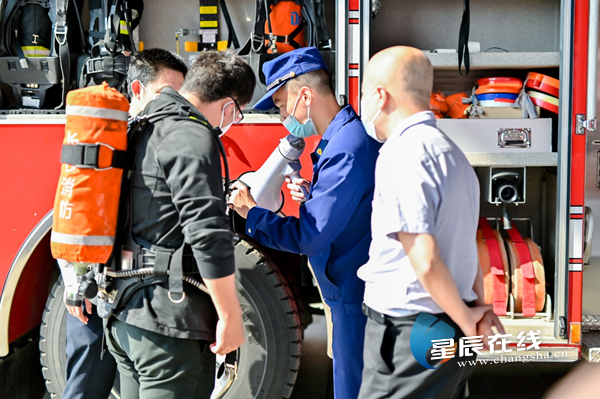 (消防员向群众讲解消防特殊器材的使用方法。)