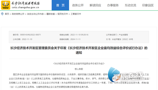 (长沙经开区出台《长沙经济技术开发区企业亩均效益综合评价试行办法》)