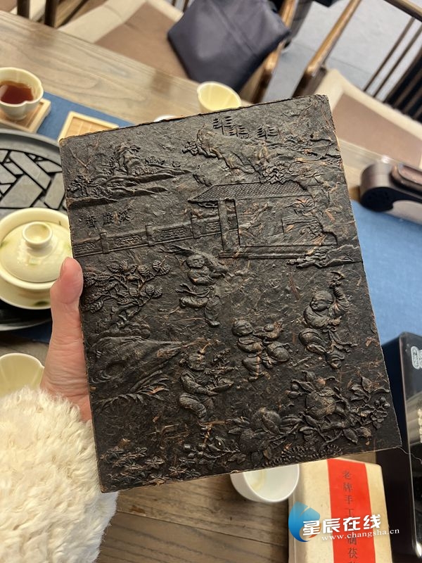 (印刻有《百子图》的黑茶茶砖。)