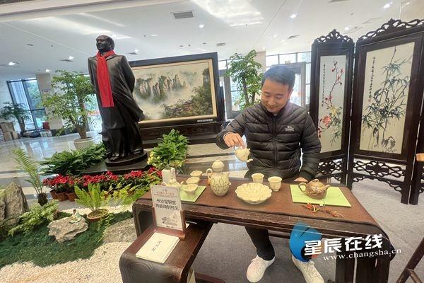 (铜官窑瓷器“泥人刘”的传人正在展示茶器。图片均由星辰全媒体记者 刘佳/摄)