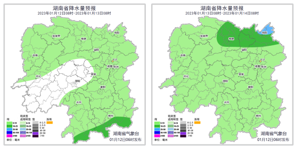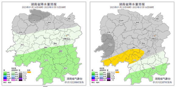 15日,湘北、湘中阴天有小雪,湘西州南部、怀化中南部局地中雪,其中怀化南部、邵阳南部、衡阳西部、永州北部局地有冻雨,湘南阴天有小雨或雨夹雪(图2右);北风4~5级;最高气温湘南3~5℃,其他地区1~3℃;最低气温-2~0℃。