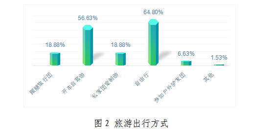 调查显示,在出游方式选择方面,有64.80%市民选择自由行,56.63%市民选择开车自驾游。随着网络的普及和发展,旅游形式呈现出多样化局面,自由行和自驾游受到热捧,越来越多的游客崇尚更加自由、个性化的旅游方式。