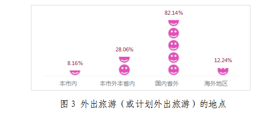 当问及“您本年外出旅游(或计划外出旅游)的地点?”时,有82.14%的市民选择国内省外游,28.06%的市民选择本市外本省内游玩。国内旅游受到热捧,迎来复苏,出境游也将逐渐步入正轨,随着国际航班逐渐复航,出行便利度愈发提高,12.24%的市民选择海外地区旅游。从事建筑行业的孙先生介绍,疫情前每年都会有出游计划,因为职业原因,他比较喜欢去各个国家看当地特色的建筑物来找灵感。疫情三年,没有出去旅游,随着今年疫情形势的好转,他又有了出游计划,现在他正在考虑办理东南亚几个国家的签证,想要在下半年淡季的时候出国旅游。