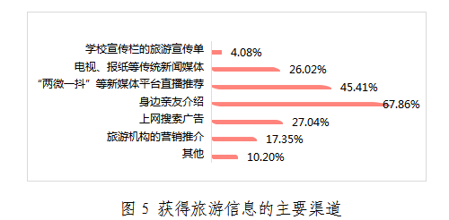 亲友介绍、“两微一抖”等新媒体平台直播推荐、上网搜索广告成为获取旅游信息的主要方式,选择的比例分别为67.86%、45.41%和27.04%。据市民李女士介绍,选择旅游地点一般都会考虑身边亲朋好友去过的地方,找他们咨询旅游信息是最真实和可靠的。