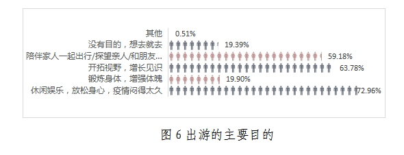 当问及“您出游的目的”时,有72.96%的市民选择休闲娱乐,放松身心,疫情闷得太久,63.78%的市民选择开拓视野,增长见识,59.18%的市民选择陪伴家人一起出行、探望亲人和朋友相聚,19.9%的市民选择锻炼身体,增强体魄,19.39%的市民选择没有目的,想去就去。而被问及“哪些因素会吸引您外出旅游”时,78.89%的市民认为地方自然风光、人文景观、特色美食吸引前往,34.44%的市民选择优质体验内容和玩法,27.41%的市民选择因为景区推出门票优惠政策。