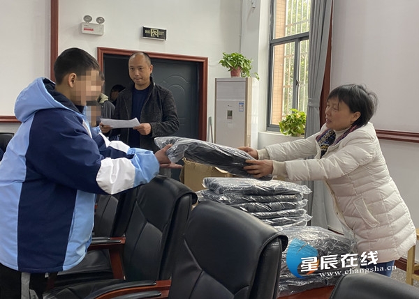 (志愿者老师为学生发放爱心冬衣。通讯员供图)