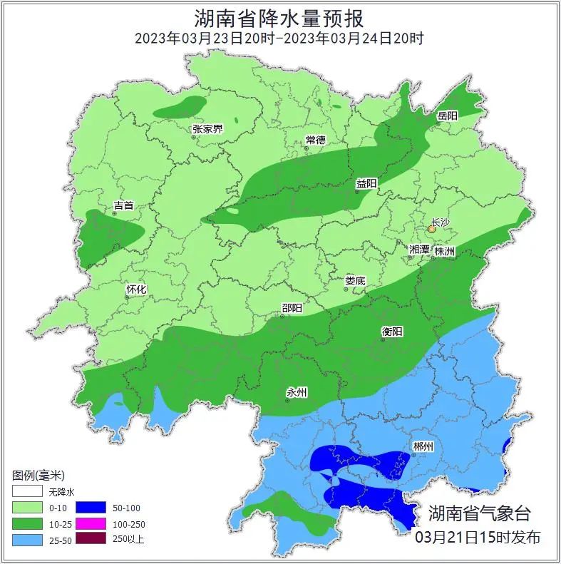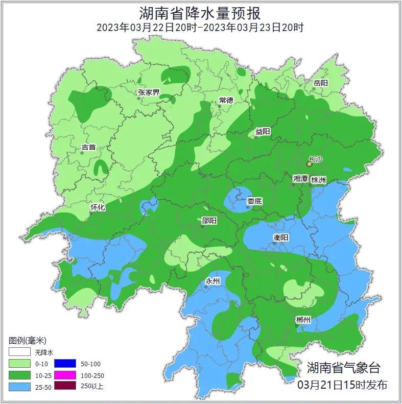23日20时至24日20时,湘南阴天有中等阵雨或雷阵雨,其中怀化南部、邵阳南部、永州、郴州、衡阳南部、株洲南部部分地区大雨,宁远、新田、蓝山、郴州市区、嘉禾、桂阳、临武、宜章有暴雨,其他地区小到中雨转阴天;北风3~4级;最高气温湘南15~17℃,湘北11~13℃,其他地区13~15℃;最低气温湘南11~13℃,其他地区7~9℃。