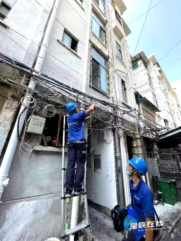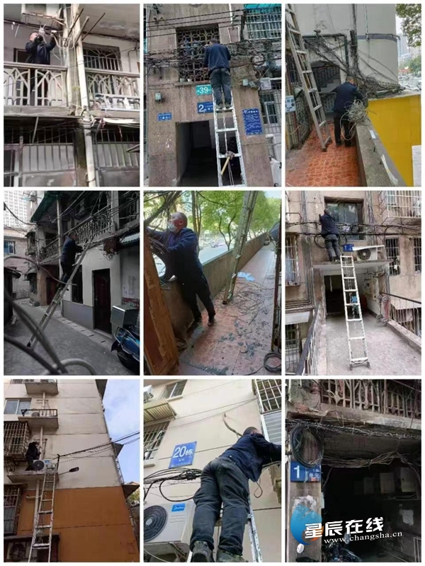 (开福区工信局联合运营商更新、维护老旧破损的通信线缆,清理已废弃线缆,合理规整布放杂乱的“飞线”。)
