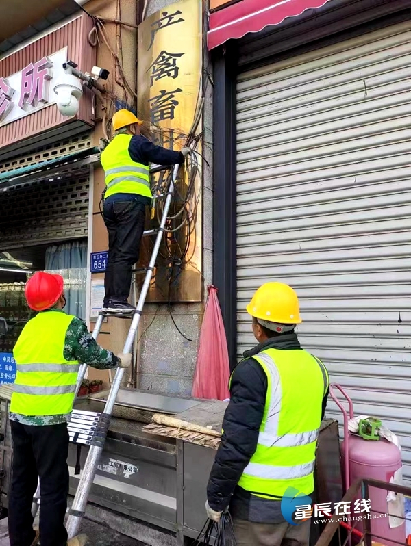 (开福区工信局联合运营商更新、维护老旧破损的通信线缆。)