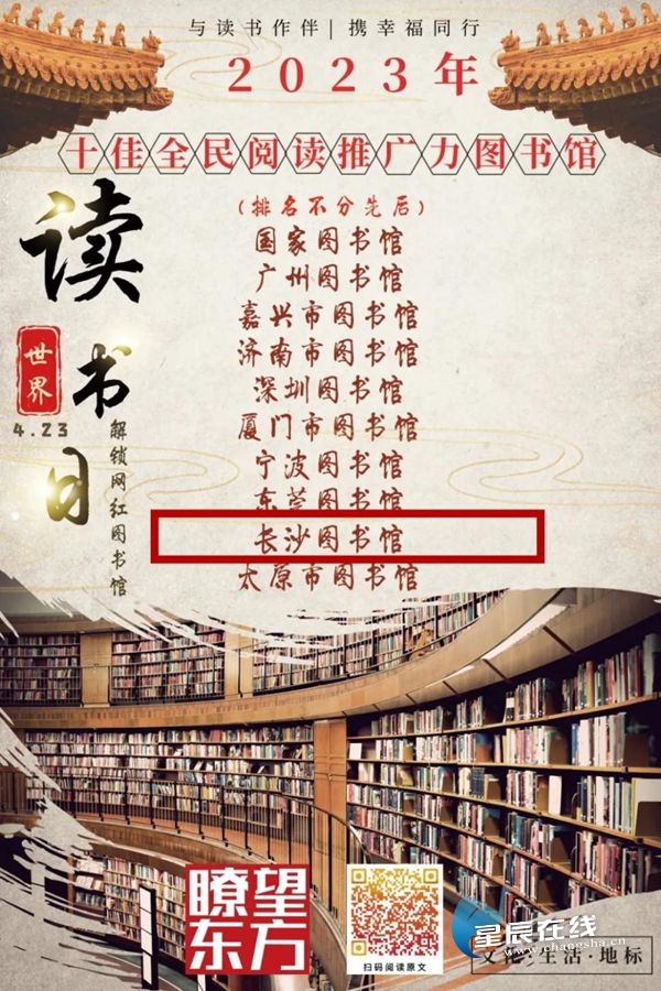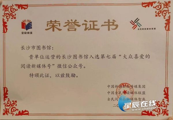 星辰在线4月28日讯(星辰全媒体记者 刘佳 通讯员 周驰宇)今年的世界读书日期间,长沙图书馆喜获两项全国行业大奖:新华社《瞭望东方周刊》发布的“十佳全民阅读推广力图书馆”和中国新闻出版传媒集团、中国全民阅读媒体联盟、全民阅读与融媒体智库联合颁发的第七届“大众喜爱的阅读新媒体号”微信公众号。