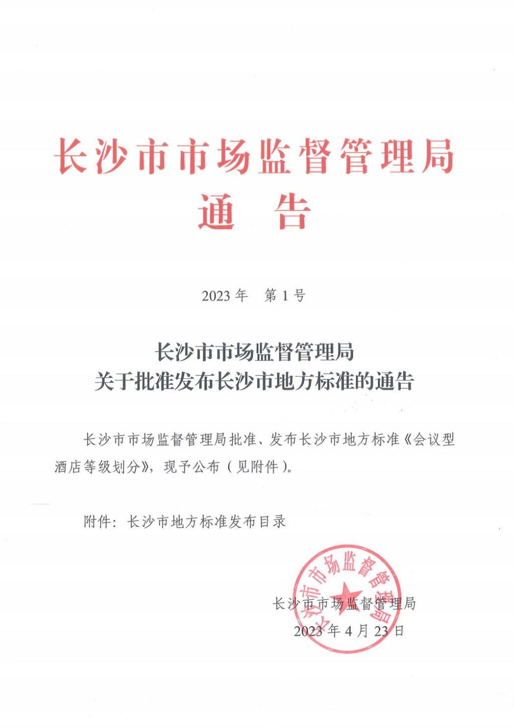 星辰在线4月28日讯 据(长沙会展)消息 2023年4月23日,长沙市市场监督管理局发布《会议型酒店等级划分》长沙市地方标准。该标准由长沙市会展工作管理办公室提出并归口,由长沙市会议产业协会牵头,湖南师范大学会展研究中心、长沙市标准化协会、湖南师范大学旅游学院、湖南锐智国际会展有限公司、圣爵菲斯大酒店、长沙北辰国荟酒店、华天大酒店等相关单位参与起草。