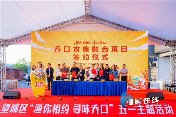 活动现场,望城区乔口镇与湖南文和友乔口小龙虾养殖有限公司、湖南子非鱼渔业有限公司、湖南众旺集团有限公司集团、湖南沃文生物科技有限公司以及岳阳嘉联生态农业股份有限公司完成5个农旅融合项目签约。搭建起共同发展、共同富裕的连心“乔”。