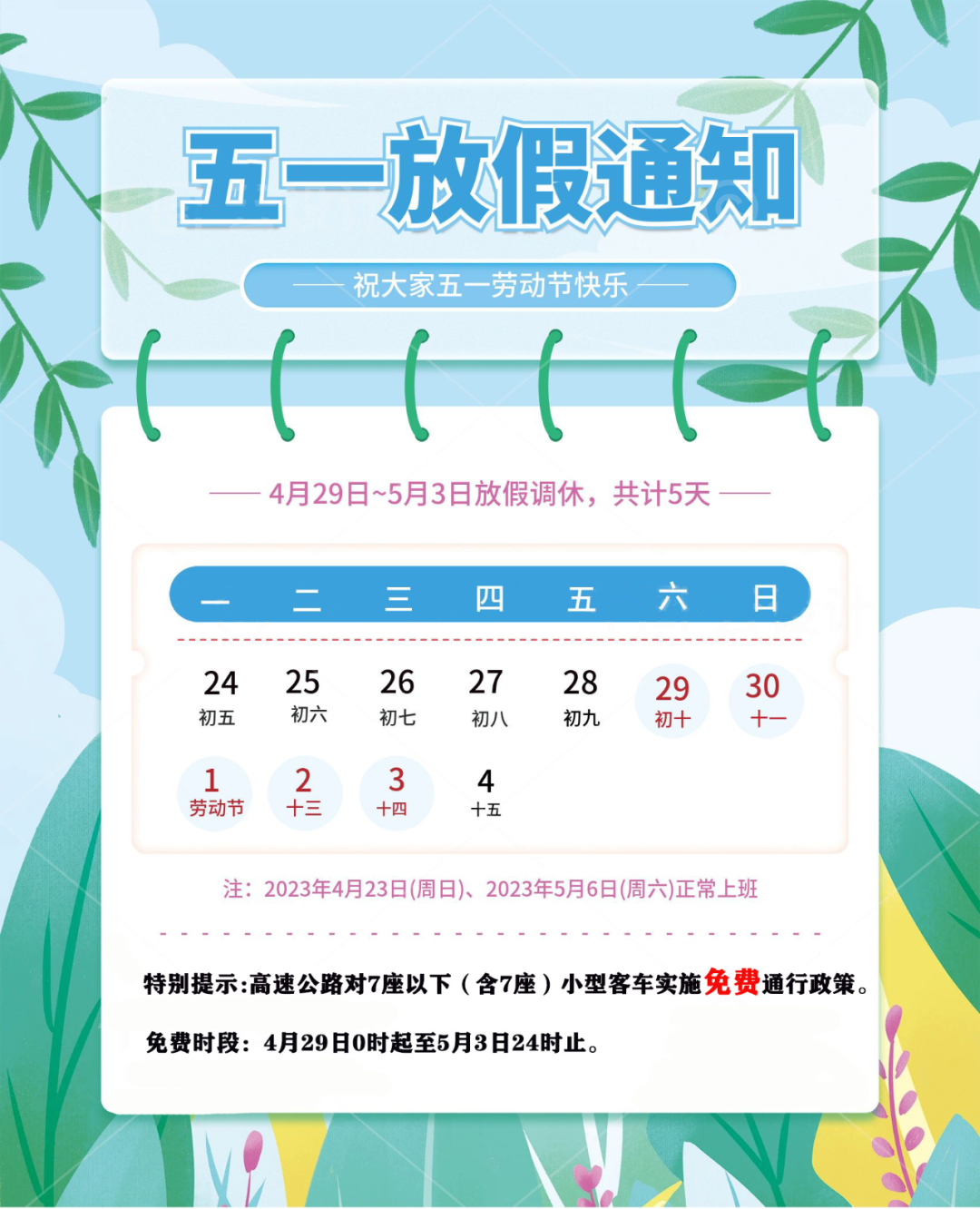 五一假期五天,高速公路对7座以下(含7座)小型客车实施免费通行政策,免费时段从2023年4月29日0时起至5月3日24时止,以驶离出口收费车道的时间为准。