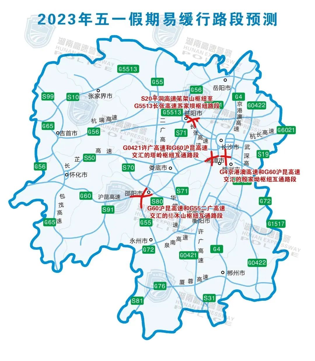 ① 建议公众在出行前关注湖南高速警察微信、微博,留意路况信息和气象信息,尽量错时错峰出行。