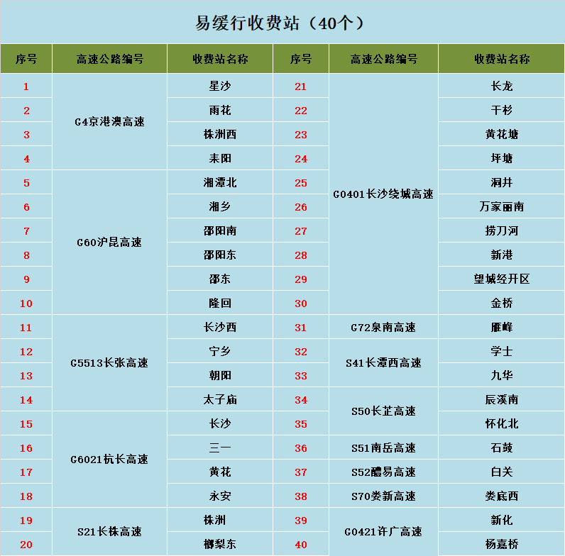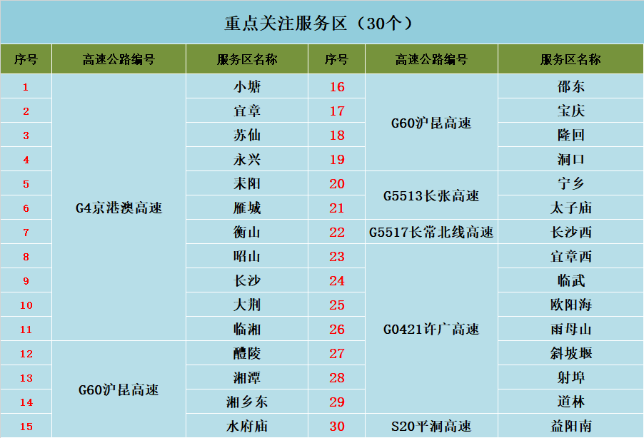 ③ G4京港澳高速长沙段1491km长沙服务区目前因提质改造关闭,公众可提前规划在G4京港澳高速临长段平江服务区、长潭段昭山服务区加油。