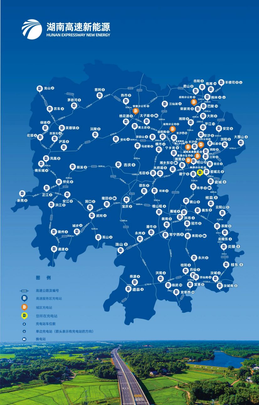 服务区充电指南:截至目前,全省高速132对服务区,共计1108个充电车位,路网基本覆盖。其中湖南高速集团投运的103.5对服务区设置有725个充电车位,省内的G4京港澳高速、G0422武深高速全覆盖;G5513长张高速、G60沪昆高速、G72泉南高速、G76厦蓉高速、G56杭瑞高速高密度布局;G55二广高速、G0421许广高速已布点充电桩。